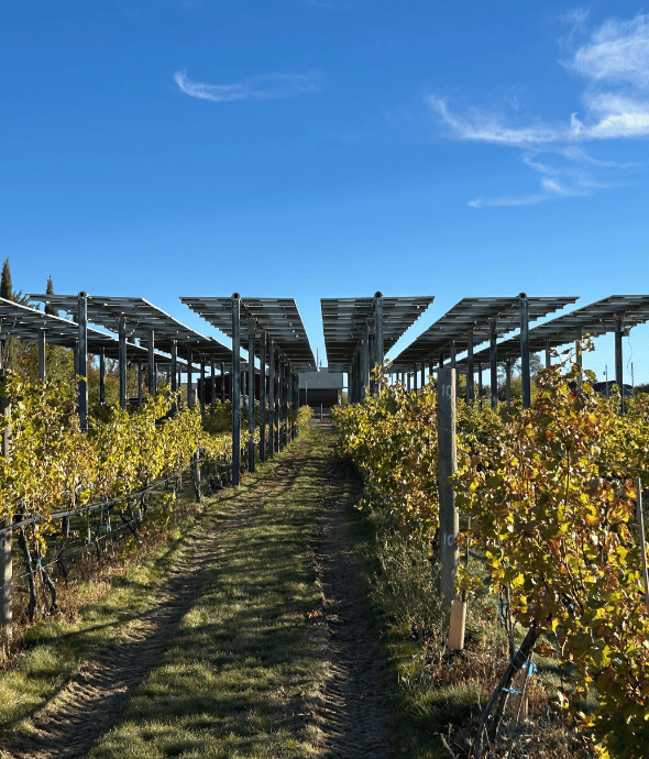 Los paneles fotovoltaicos semitransparentes permiten el paso de luz hacia las plantas, transformando al mismo tiempo parte de la radiación solar en electricidad. Las vides continúan creciendo bajo la estructura mientras el sistema produce energía renovable. La sombra parcial protege el cultivo del calor excesivo y de la radiación intensa, y reduce la evaporación del agua del suelo. El sistema está diseñado para condiciones de campo abierto, con una alta resistencia mecánica y una vida útil superior a 25 años.